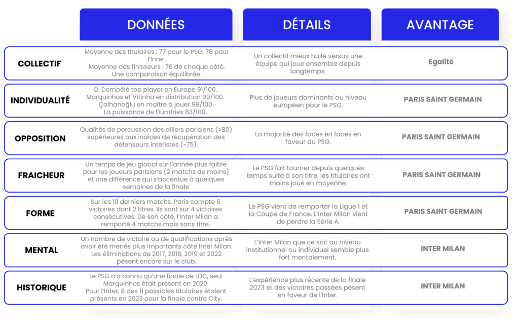 Ces informations résumées nous permettent une comparaison plus facile des joueurs et peuvent ainsi être utilisées dans un modèle d’IA pour la prédiction du résultat de cette finale de Ligue des Champions.