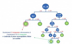 La forêt d’isolation ( » Isolation Forest « ) est une méthode de détection automatique des anomalies développée en 2008 et dont le principe est de construire un ensemble d’arbres d’isolation pour séparer les individus. Chaque arbre d’isolation est construit sur un échantillon tiré aléatoirement, ce qui vaut la particularité à l’Isolation Forest ne pas être obligé d’utiliser toutes les données pour construire l’ensembles des arbres. Le principe d’un arbre d’isolation est de diviser les données de manière itérative en commençant à la racine de l’arbre (nœud initial de l’arbre comportant l’intégralité des données). Pour se faire, à chaque nœud nous sélectionnons aléatoirement une variable et un seuil, qui permettent de séparer les données en deux sous-échantillons distincts. Le postulat est qu’un individu atypique se retrouvera plus rapidement isolé (seul dans son nœud) qu’un individu standard. Ceci se base sur la supposition qu’une anomalie est dotée de variables avec une valeur très différente des individus « standards ».