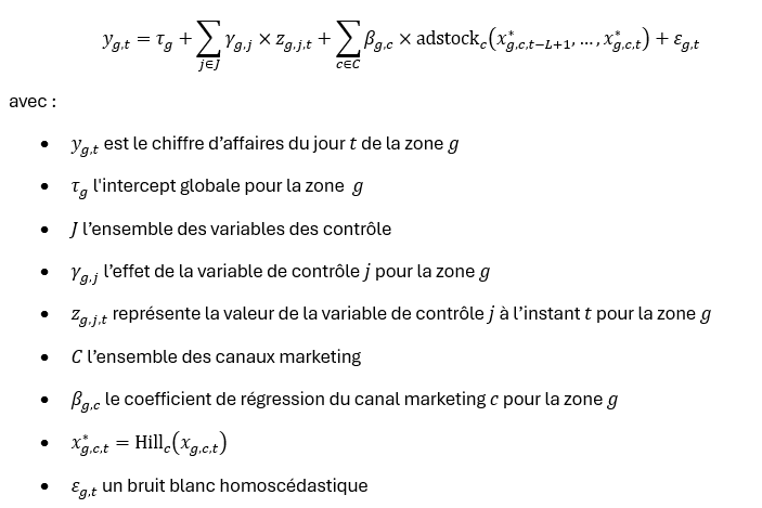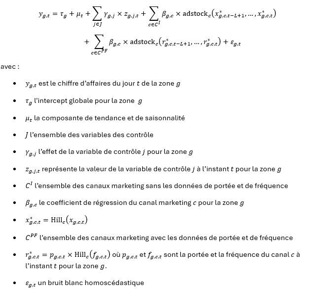 Cependant, les modèles traditionnels de MMM présentent certaines limitations. C’est pourquoi Google a développé deux modèles de MMM en open-source : lightweightMMM en 2022 et Meridian en 2025 qui sont exprimés ci-dessous.