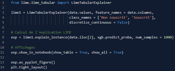 Différents graphiques sont possibles en fonction des affinités ! Dans tous les cas, pour cet individu (le même que pour Shapley), nous voyons que, malgré sa probabilité proche de 0, la variable duration a eu le plus d’importance et a eu tendance à augmenter la probabilité finale. Cette analyse est en contradiction avec la méthode Shapley ; c’est dû à trois raisons, qui peuvent faire la faiblesse de LIME :