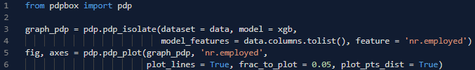 Le fait d’analyser le lien entre variable explicative et cible avant la création du modèle est moins robuste que les méthodes PDP & ICE, car nous ne prendrions pas en compte les effets d’interaction entre toutes les variables explicatives. Pour la variable nr.employed utilisée, nous voyons que les valeurs plus faibles ont un impact similaire, alors que des valeurs supérieures à 5100 ont un impact négatif. La relation semble similaire pour tous les individus. Note : la ligne jaune et noire correspond au PDP.
